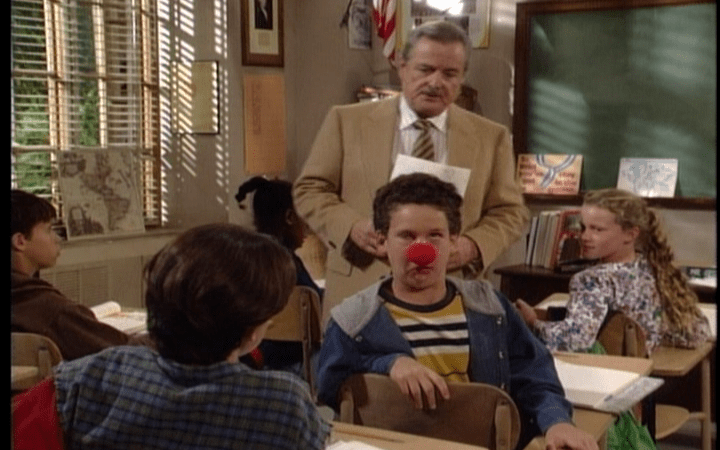 Cory feels insulted early in the episode, when Mr. Feeny chastises him for a ‘C’ grade while commending a fellow student’s effort for the same result The teacher correctly (and privately, as not to embarrass the other student) points out some need to work harder for less than others. And Cory, he bluntly assesses, only seems interested in being the “class clown” (which is made clear, if you couldn’t connect the dots, with a red rubber nose he wears). Believing his teacher is “always picking on” him unfairly, he takes the IQ results from the trash thinking he’ll earn respect and “get Feeny off (his) back.” Shawn, the wise, world weary young man he is, advises his friend to let it go and not “complicate” his life, but the foolish Mr. Matthews moves forward.